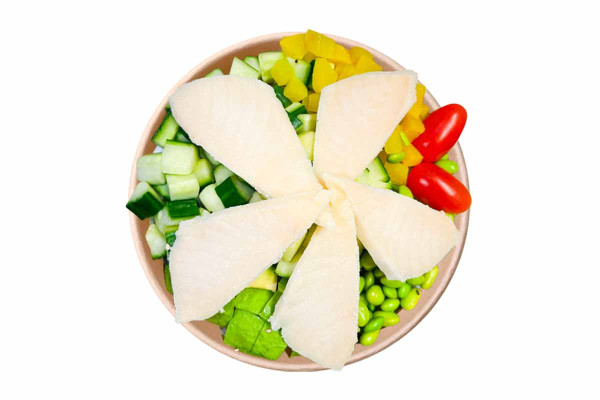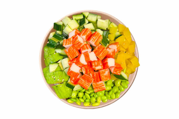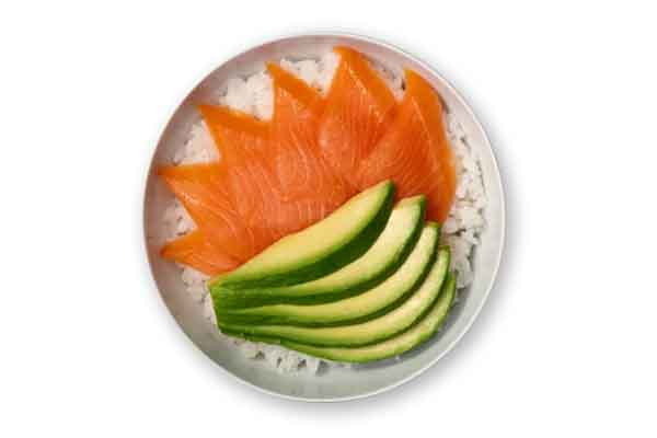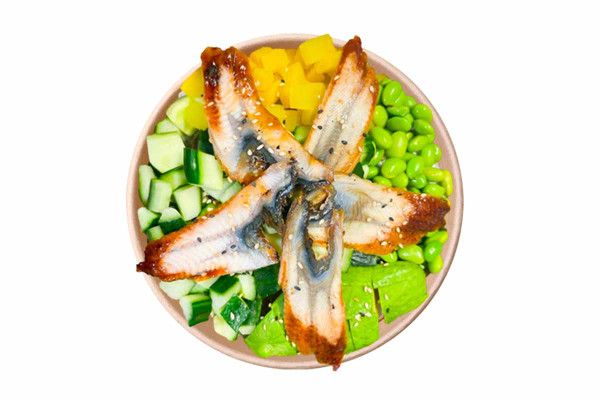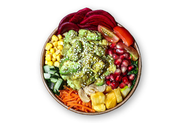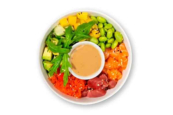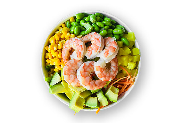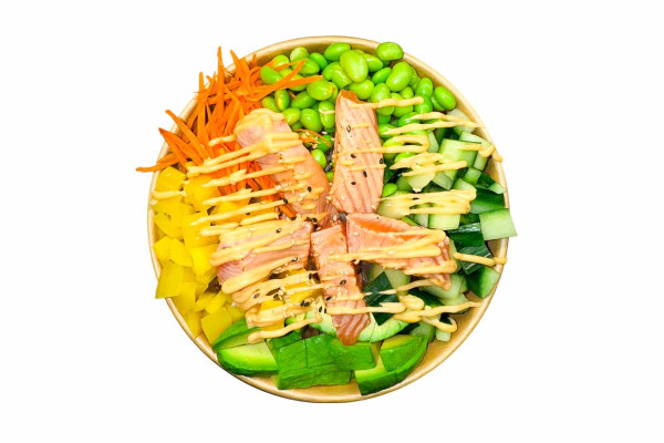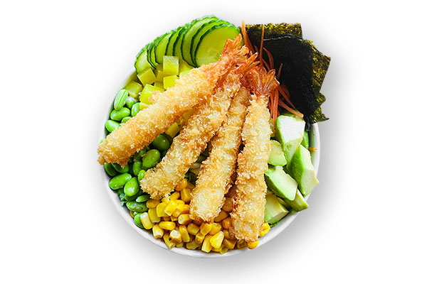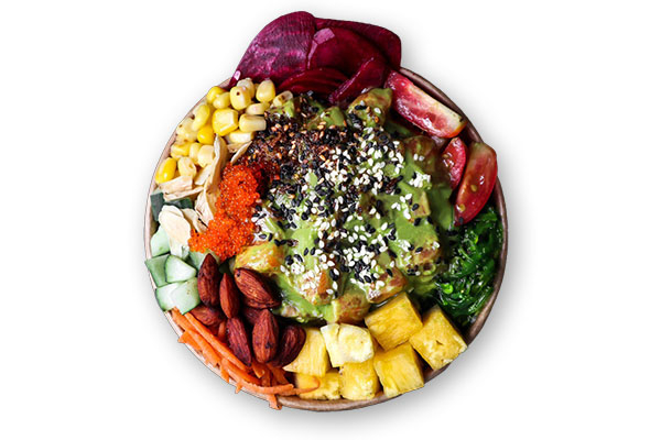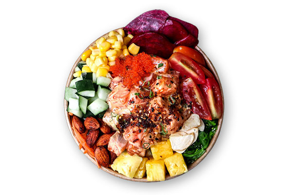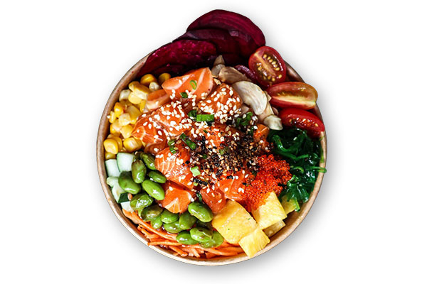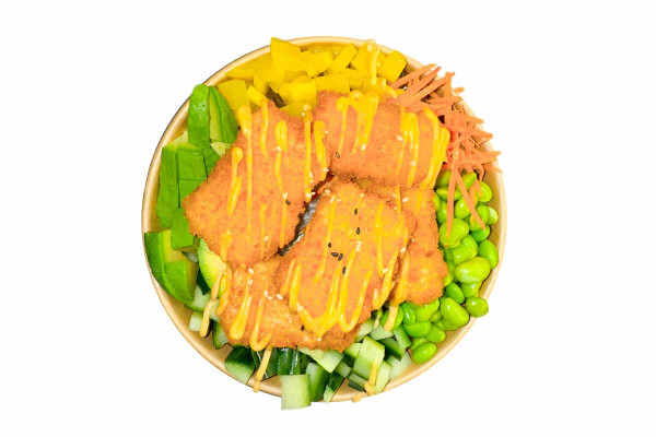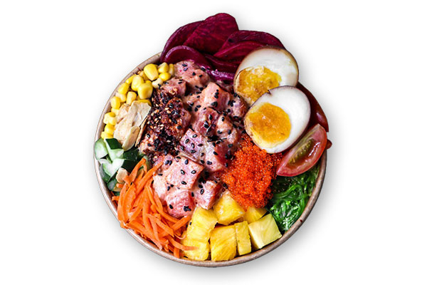 Sous Vide Dashi kuře ( 75g ) s nakládaným vajíčkem ramen a prémiovou polevou. Sushi rýže, 7 lahodných přísad (okurka, řasa wakame, mrkev, cherry rajčátka, medový ananas, kukuřice a nakládaná červená řepa). Signature Umami Drizzle omáčka, koktejlová majonéza, smažená cibulka. 550 g